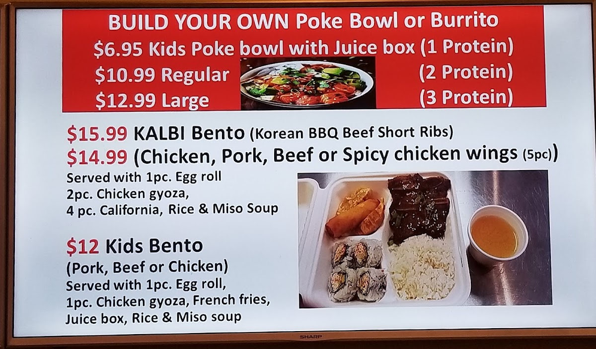 Served with rice, beef , wonton, eggroll, gyoza & juice box
