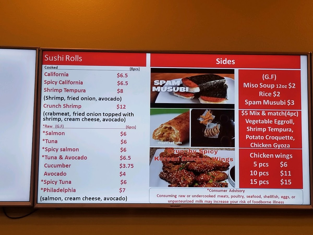 Served with Egg roll (1pc) , Chicken gyoza (2pcs) , rice & Choice of California roll (5pc) or Spam Musubi (1pc) and Can soda
